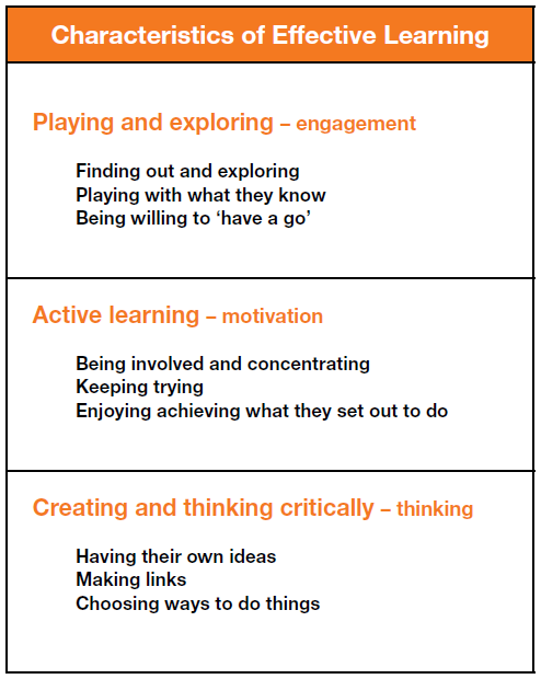 Through building positive relationships, we aim to develop and foster the characteristic of effective learning* in every child. Children are encouraged to become well-regulated and sociable through the modelling of positive interactions and language at all times. Our learning environments, alongside interactions with our skilled practitioners, are carefully planned and resourced to allow children the opportunities to:
